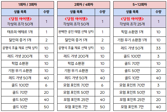 - 경품 추첨은 총 12회차까지 있으며, 회차별로 획득할 수 있는 보상은 다음과 같습니다.